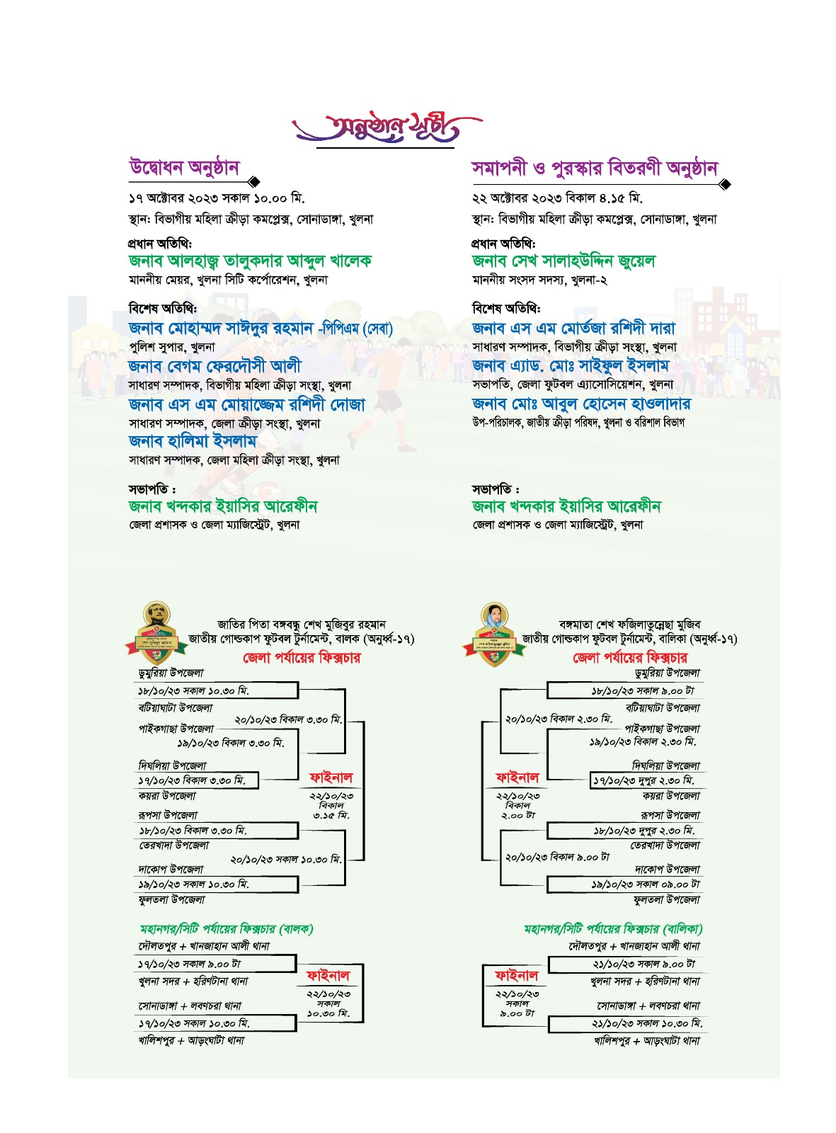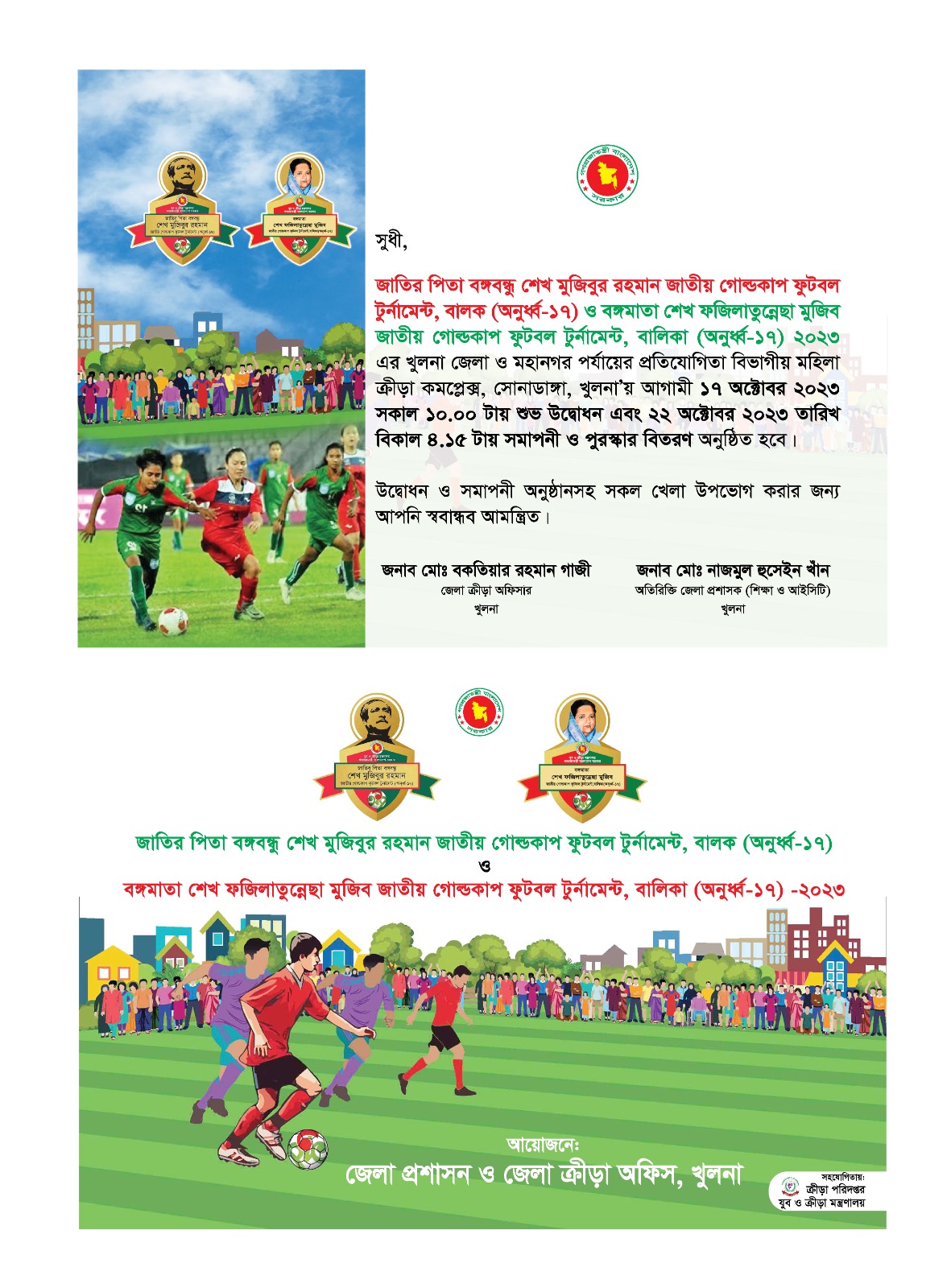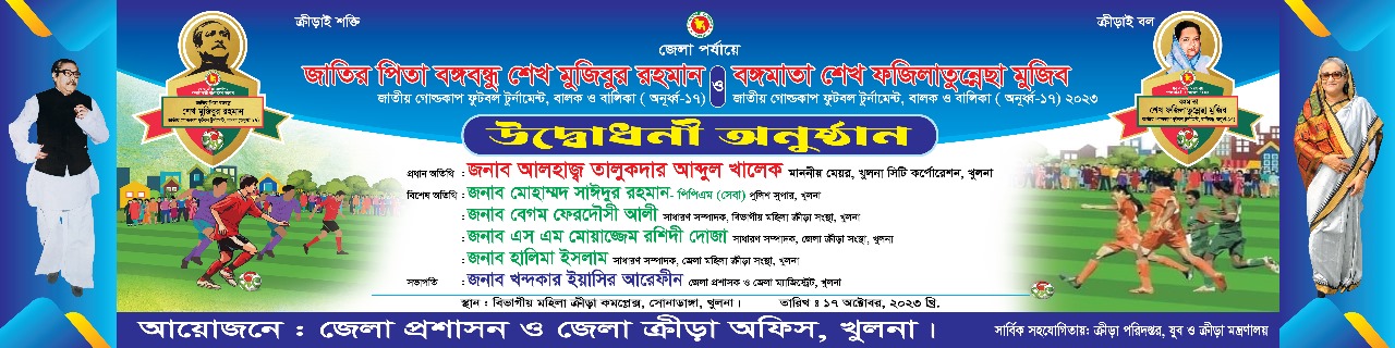 গত ১৭- ২২ অ্ক্টোবর ২০২৩ খুলনা বিভাগীয় মহিলা ক্রীড়া কমপ্লেক্ষে অনুষ্ঠিত হবে জাতির পিতা বঙ্গবন্ধু শেখ মুজিবুর রহমান জাতীয় গোল্ডকাপ ফুটবল টুর্নামেন্ট, বালক ( অনূর্ধ্ব-১৭) ও বঙ্গমাতা শেখ ফজিলাতুন্নেছা মুজিব জাতীয় গোল্ডকাপ ফুটবল টুর্নামেন্ট, বালিকা ( অনূর্ধ্ব-১৭) জেলা পর্যায়ের খেলা।